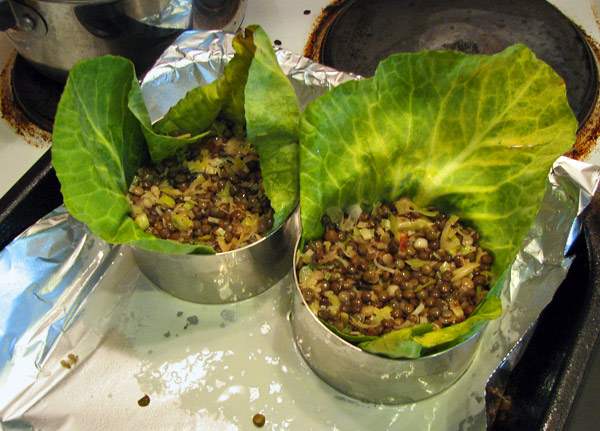 - Line each ring/ramekin with 2 leaves chard/spring greens leaving enough hanging over to seal the top