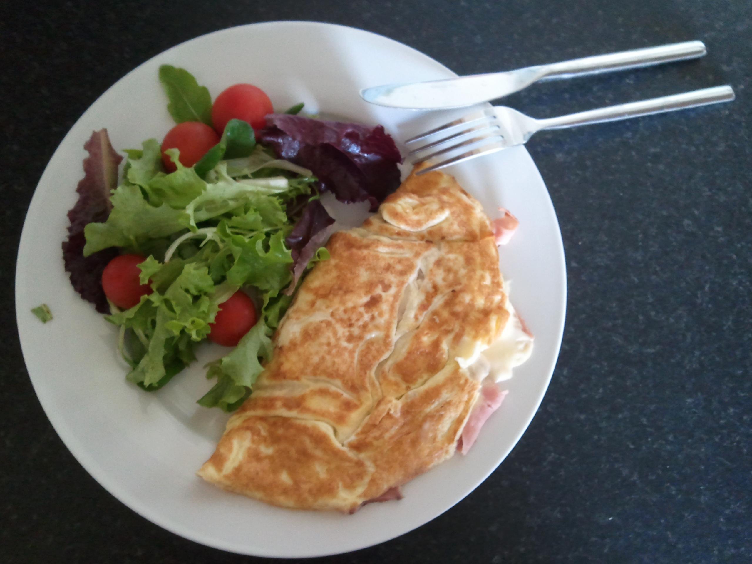 Dinner - Gammon, 2 boiled eggs, boiled potatoes, salad cream light (3 syns), large salad of lettuce, cucumber, tomatoes