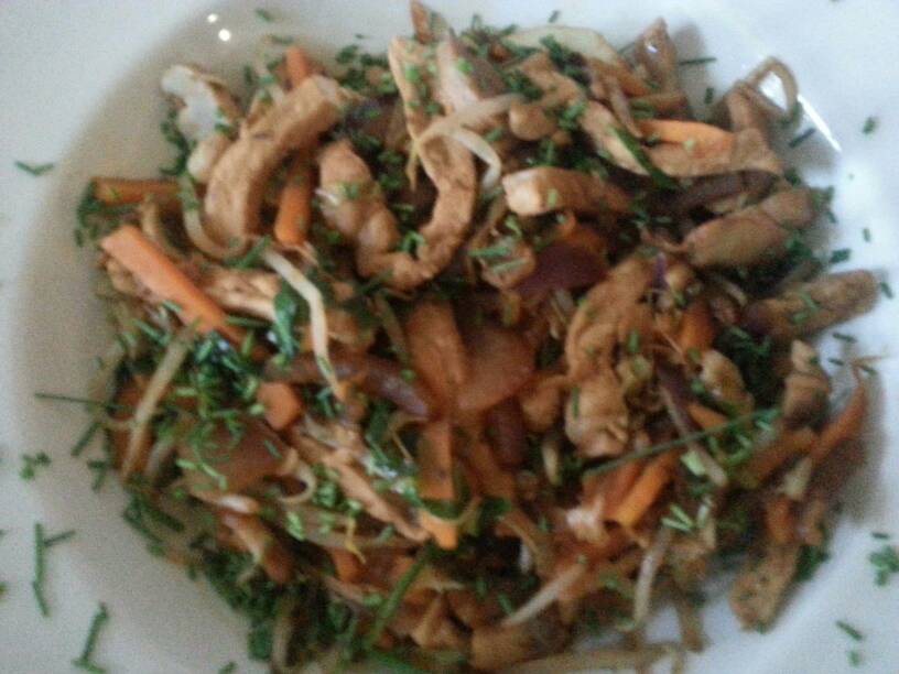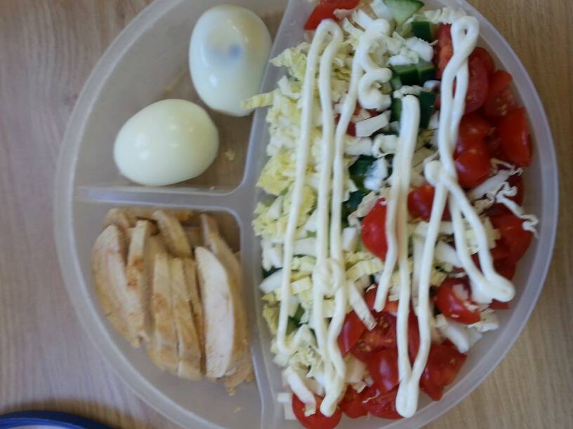 9. SALAD: chicken, lettuce, tomatoes, cellery, peppers, cucumber, eggs and syns used on mayo. Also had a pork stir fry for tea. :D