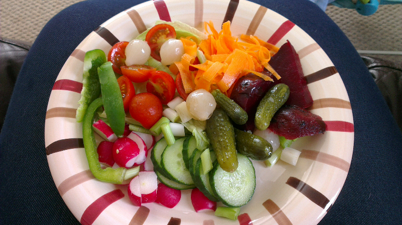 Salad: lunch- lettuce, tomato, cucumber, pepper, radish, picked onions, pickled gherkins, beetroot, spring onion and large peeled/grated carrot.