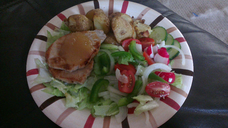 Tea- lettuce, tomato, cucumber, onion, radish. Pork loin, roast potatoes. 1.5syn on apple sauce.