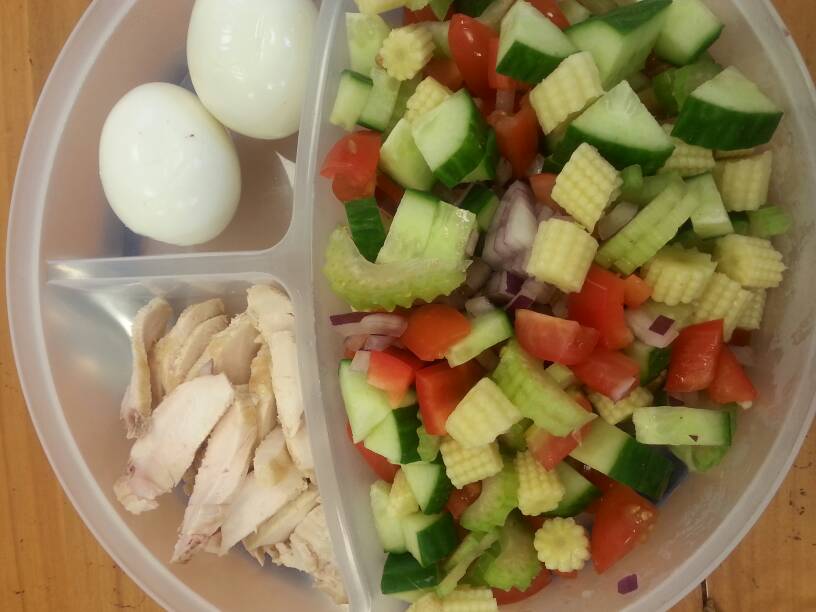 9. SALAD: chicken, lettuce, tomatoes, cellery, peppers, cucumber, eggs, carrots, onion. Also had a quorn stir fry for tea. :)