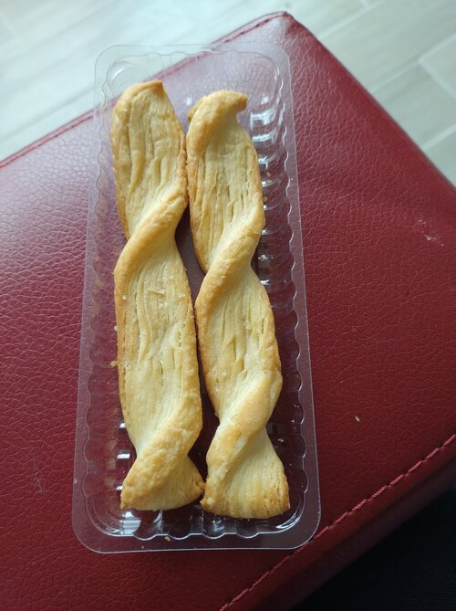S - pkt niknaks, boiled sweet, pkt crisps, pears