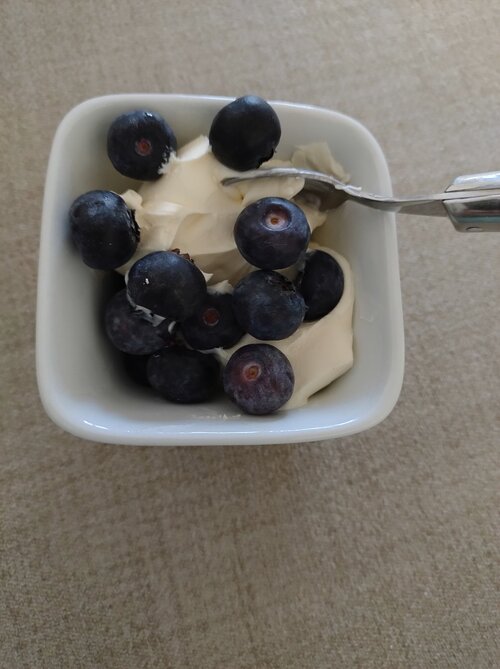 S - Mascarpone with strawberries & blueberries. Eating more than usual to get my metabolism working harder