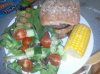 Homemade burger with babybel light (hex) inside and chopped peppers, served on wholemeal bun (hex) rocket and mushrooms... salad leaves tomatoes cucumber and olives (1 syn)