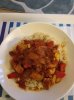 Chicken and sweet pepper curry, saag aloo, brown rice and lime pickle